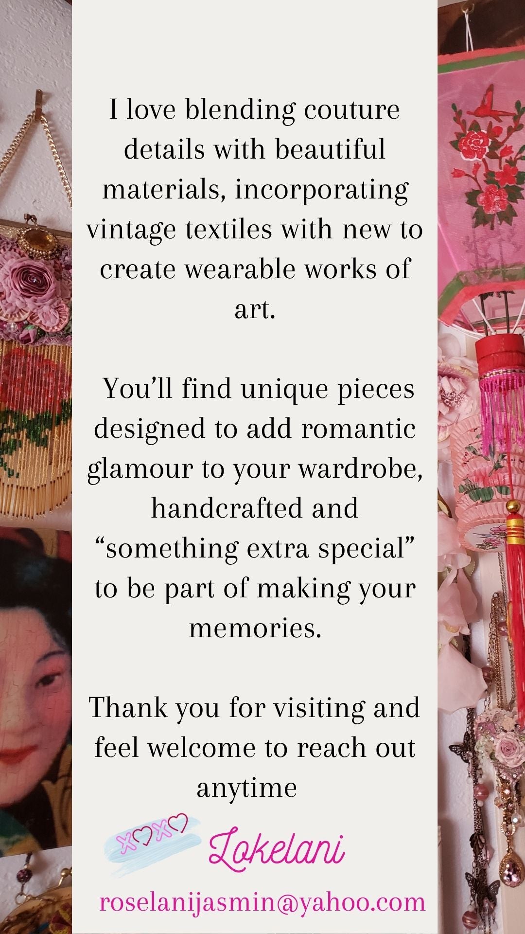 Welcome to Roselani Jasmin, where you’ll find works of romantic artistry in clothing design, lovingly handcrafted in California. Each piece is unique, one-of-a-kind, or a limited-edition design meant to express your romantic sense of style and leave an impression wherever you go.  You'll also find vintage treasures woven throughout.