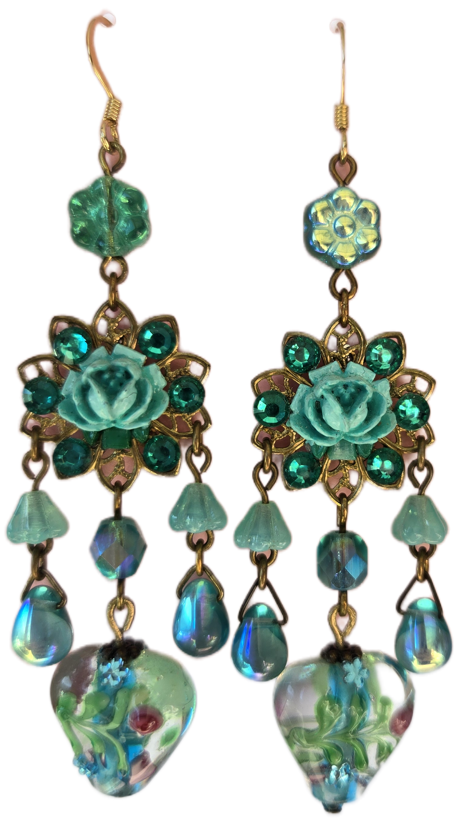 Whimsical shades of aqua, mint, seafoam and sky blue permeate these earrings. Victorian style filigree are centered with sweet roses offset by luminous gems.