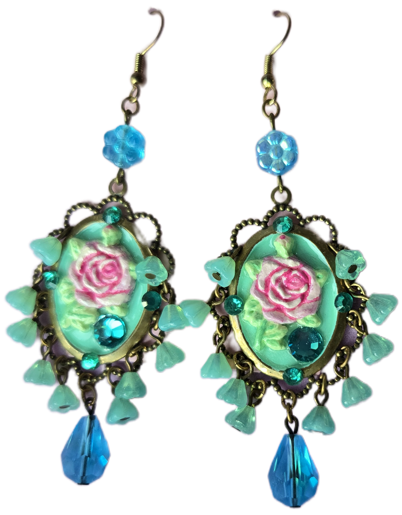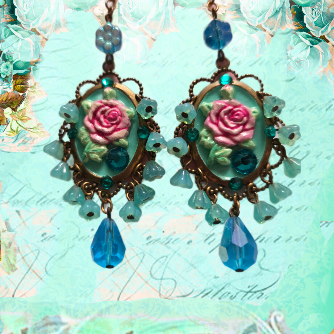 Handcrafted with care, these one-of-a-kind earrings blend gypsy flair with vintage elegance. Featuring brass cameo settings adorned with hand-molded roses, sparkling rhinestones, and charming blue daisies, each pair is uniquely hand-painted. The delicate glass flower fringe adds a soft, whimsical touch, making these earrings a beautiful statement of artistry and grace. Perfect for adding a romantic, timeless accent to any look.