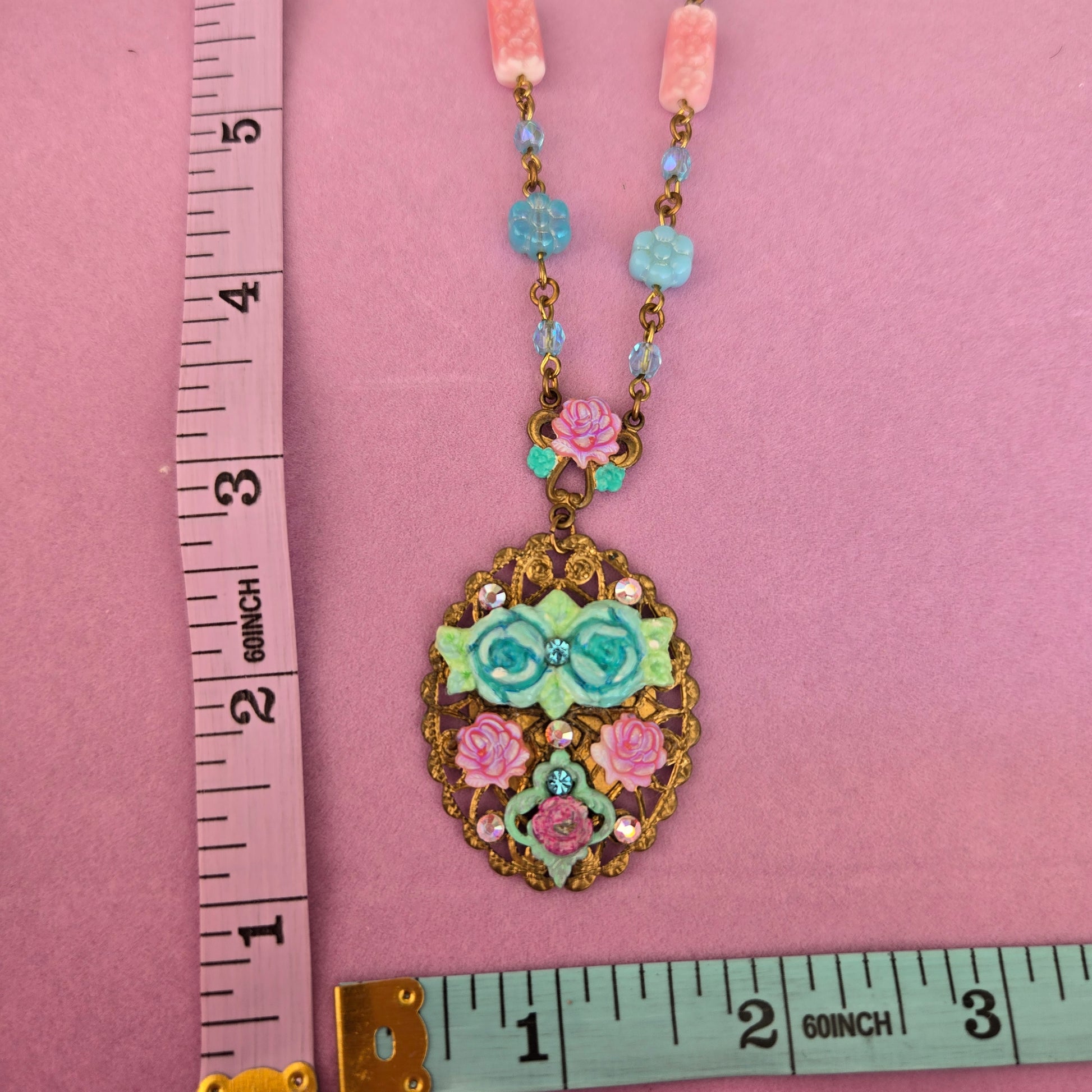Echoing the past of 1920's style in mind - a gleaming filigree medallion features lovely hand-molded cabbage roses, with shimmering crystal accents giving a nuanced glamour. Capturing a luminous glow, vintage rose glass cabochons also playfully reside in the design. This can be worn alone or layered with other collected necklaces!
