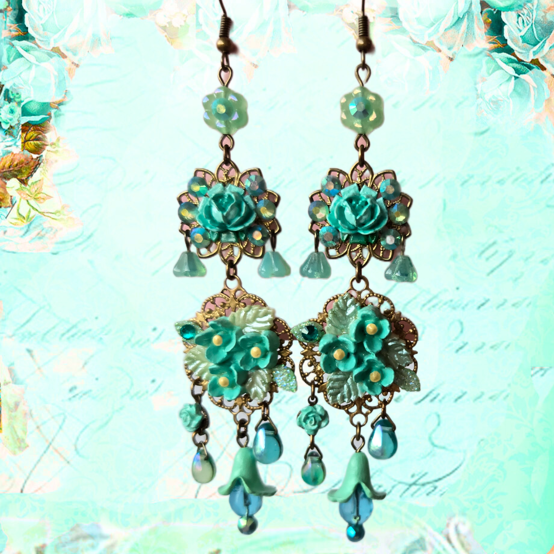 Transform your special occasion look with these enchanting chandelier earrings that honor botanical artistry. Delicate blue hydrangeas and roses are beautifully rendered across intricate snowflake filigree, showcasing a stunning palette of aqua and sky blue. Cascading teardrops and fuchsia accents flow gracefully, creating visual interest and movement with every wear. Perfect for weddings, galas, and celebrations, these romantic statement pieces deliver the elegance and beauty that makes you feel absolutely radiant. Choose earrings that capture the essence of timeless romance and natural grace.
