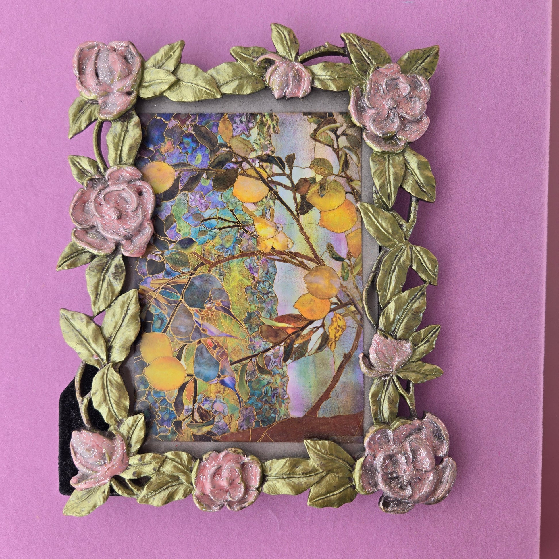 Let your favorite memories shine in this delightful silvery frame, with painted pink roses. Romantic rose vines curve gracefully over this Art Nouveau-style picture frame ideal for any shelf, vanity or tabletop. Whether displaying cherished photos or framing pieces of art, this vintage gem sparkles.