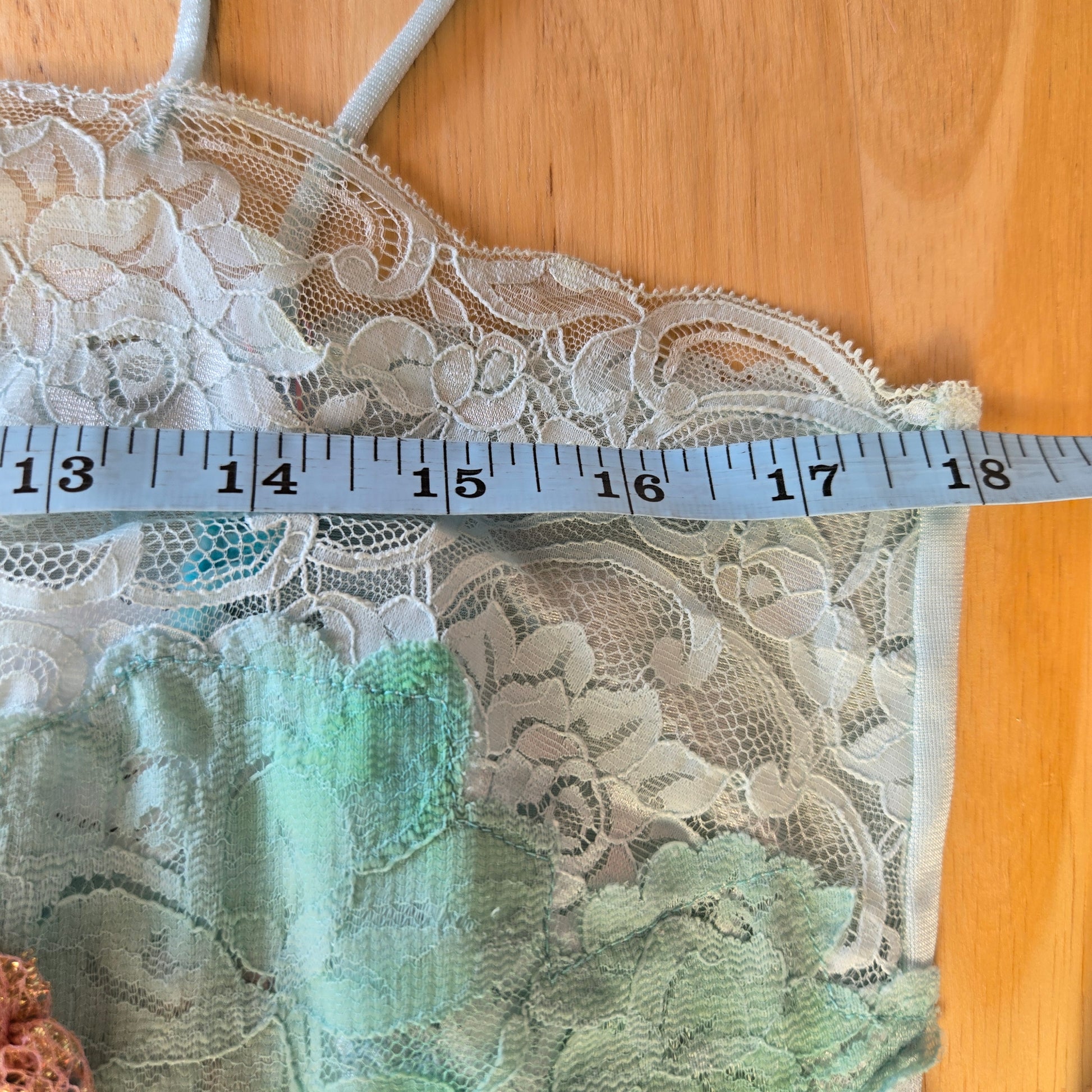 This one-of-a-kind top blends Deco elegance with a boho soul, creating a truly unique and dreamy vibe. The focal point is a beautiful vintage cream crochet doily adorned with a delicate pink applique and a pale blue butterfly. The design is a symphony of textures, vintage laces and charming hand-worked flowers.